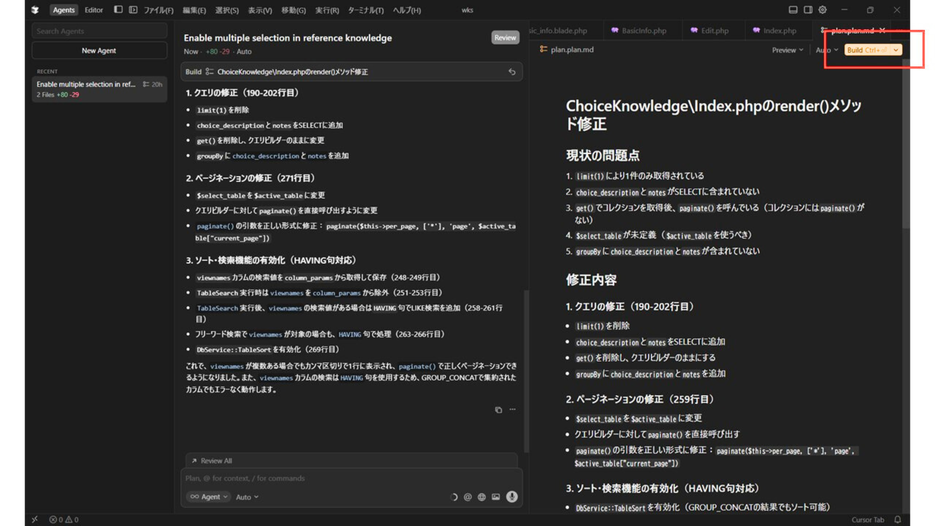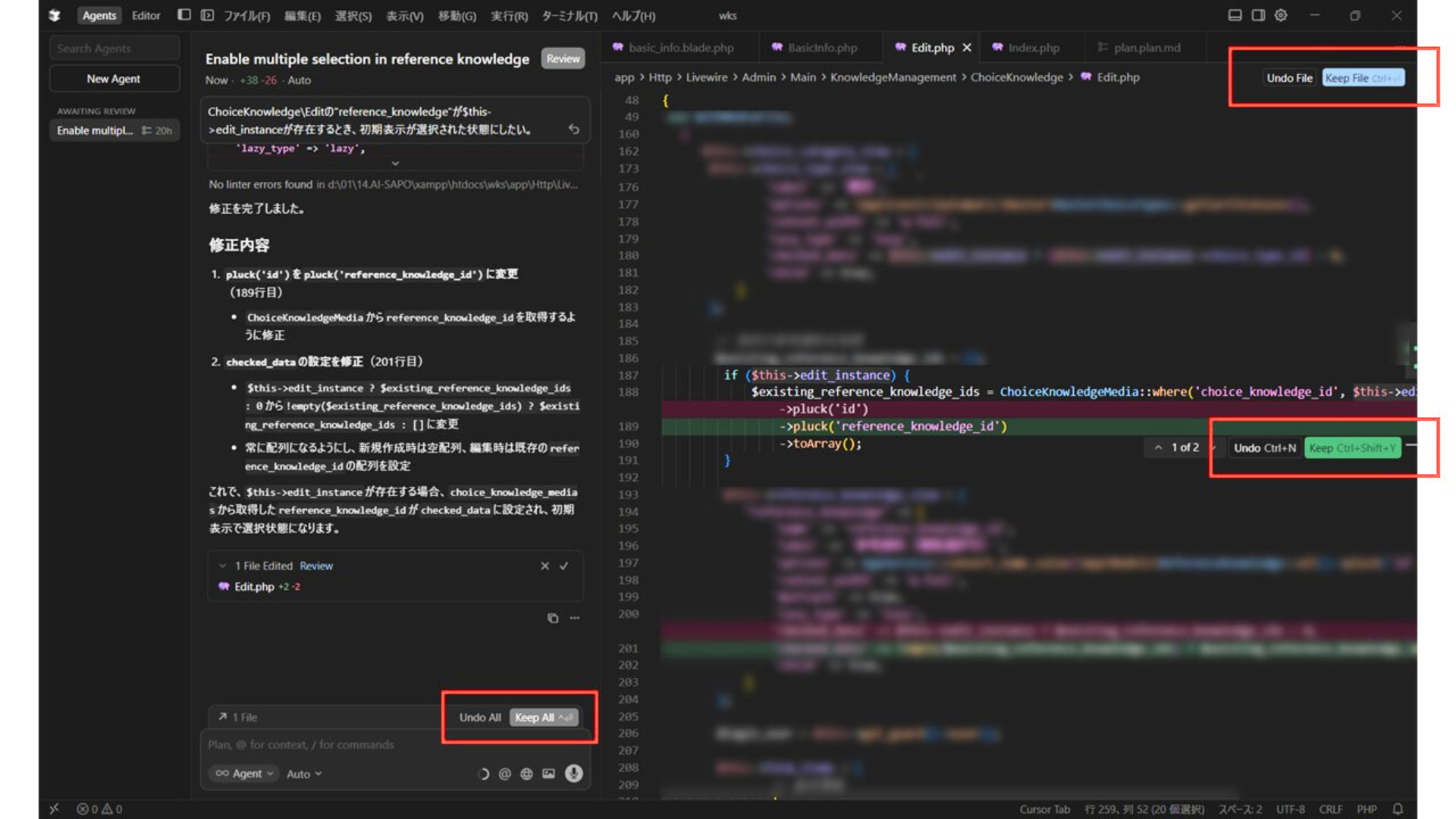 普通のエディタやAIでは難しい「関連ファイルの同時更新」を、CursorのAIがまとめて行ってくれます。 こちらの指示をもとに、AIが依存関係を理解して複数ファイルを自動修正します。